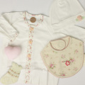 出産祝いにぴったりなベビーアイテムの5点セットです。ツーウェイドレス・キャップ・スタイ、靴下、ハート型のニギニギがセットになっています。